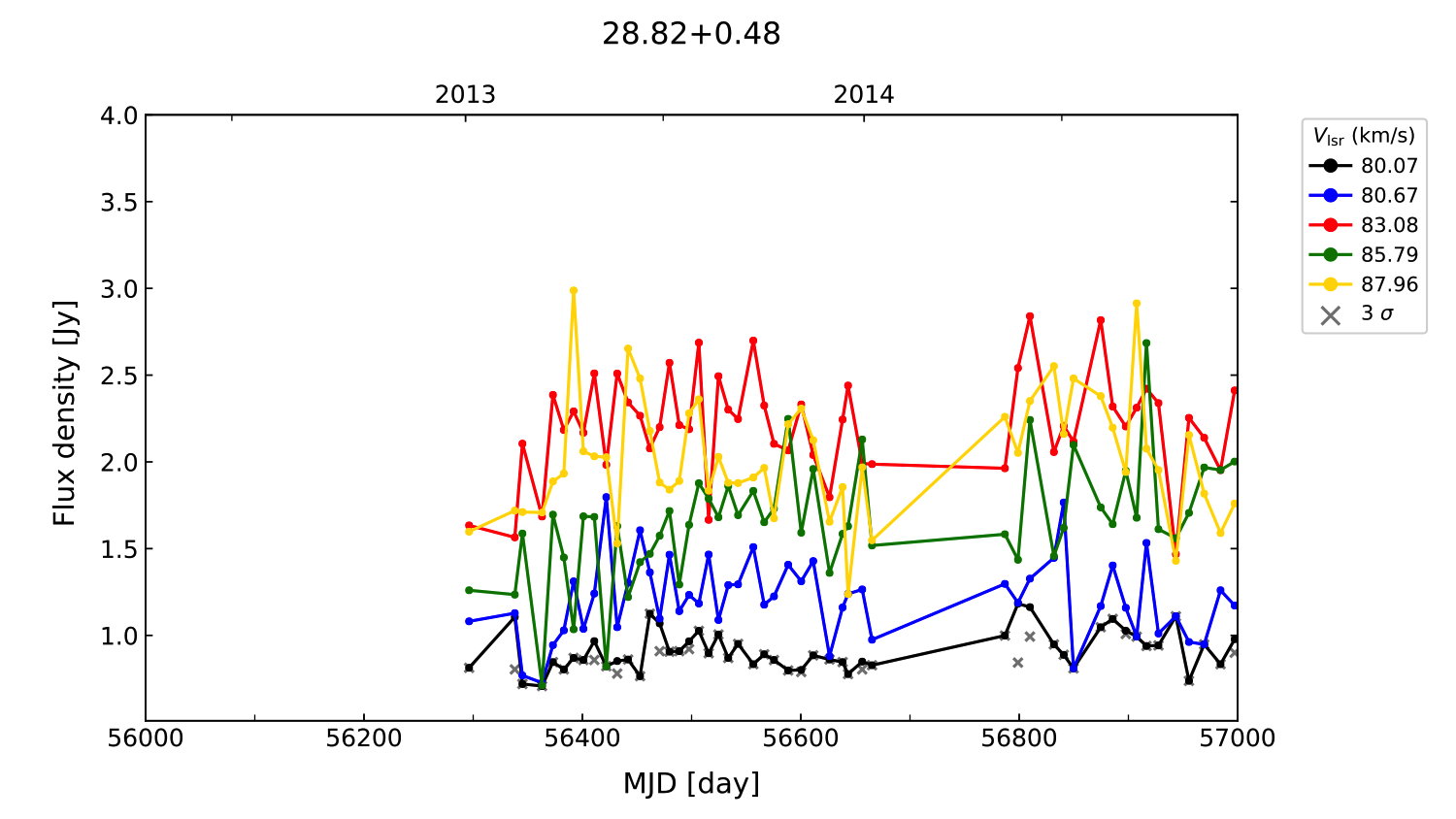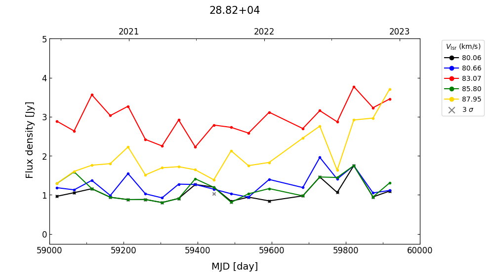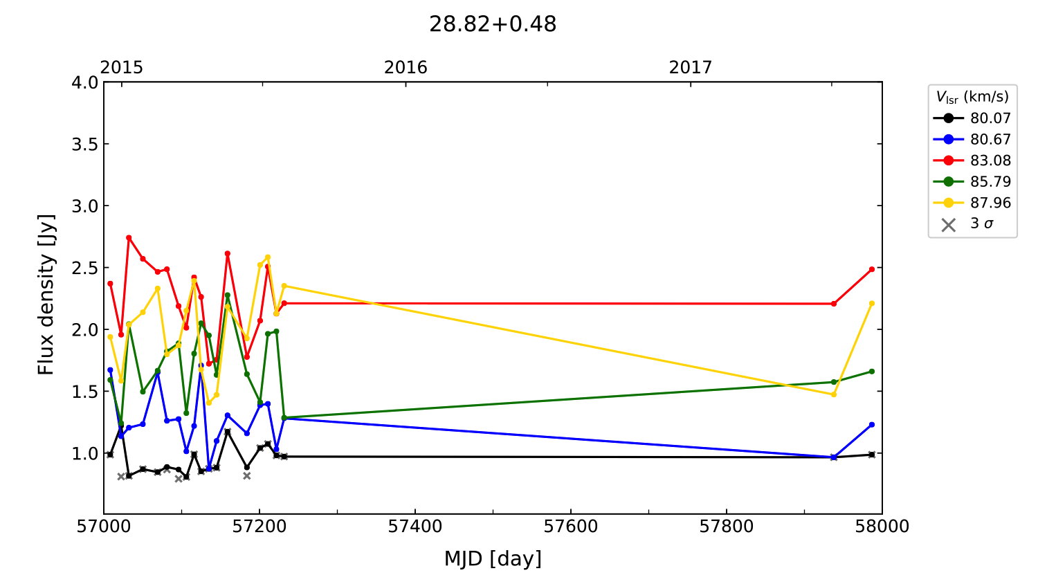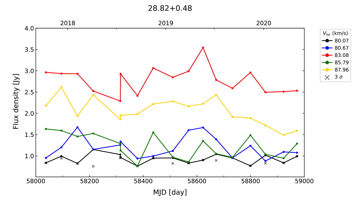 (L,B) = (028.829, 000.488) (RA, DEC [J2000]) = (18 42 12.43, -03 25 39.500)